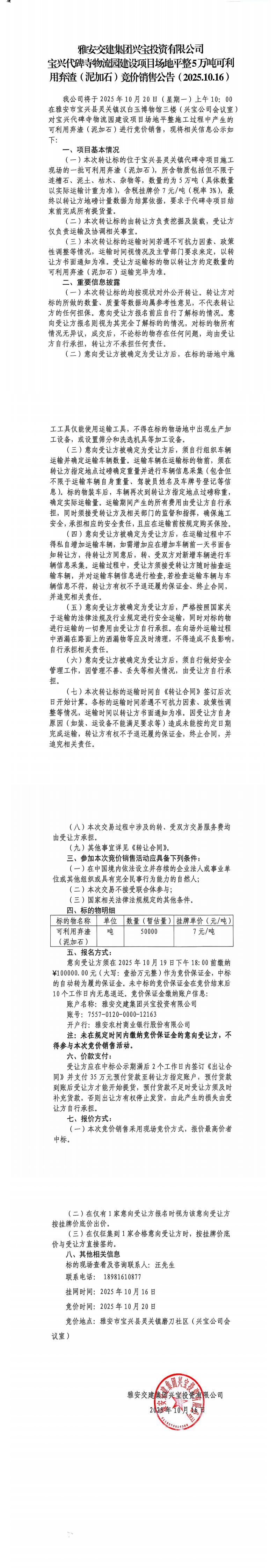 雅安交建集團(tuán)興寶投資有限公司寶興代碑寺物流園建設(shè)項目場地平整5萬噸可利用棄渣(泥加石)競價銷售公告(2025.10.16)