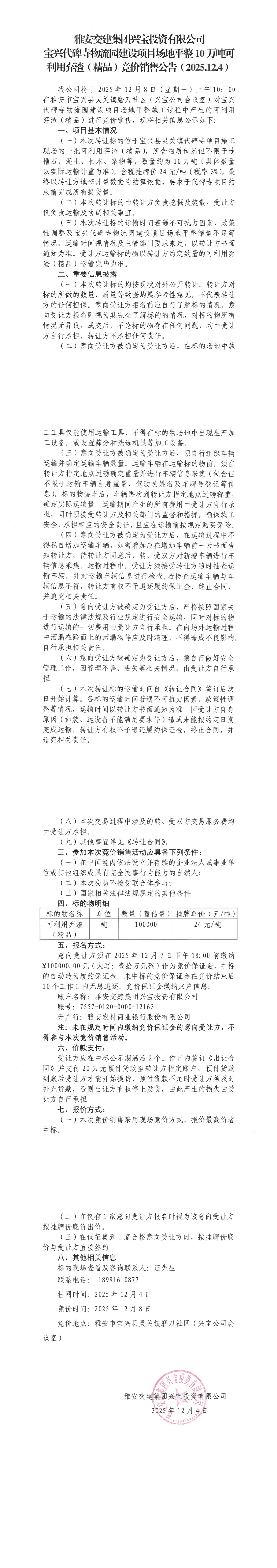 雅安交建集團(tuán)興寶投資有限公司10萬噸可利用棄渣(精品)競(jìng)價(jià)銷售掛網(wǎng)公告(2025.12.04)